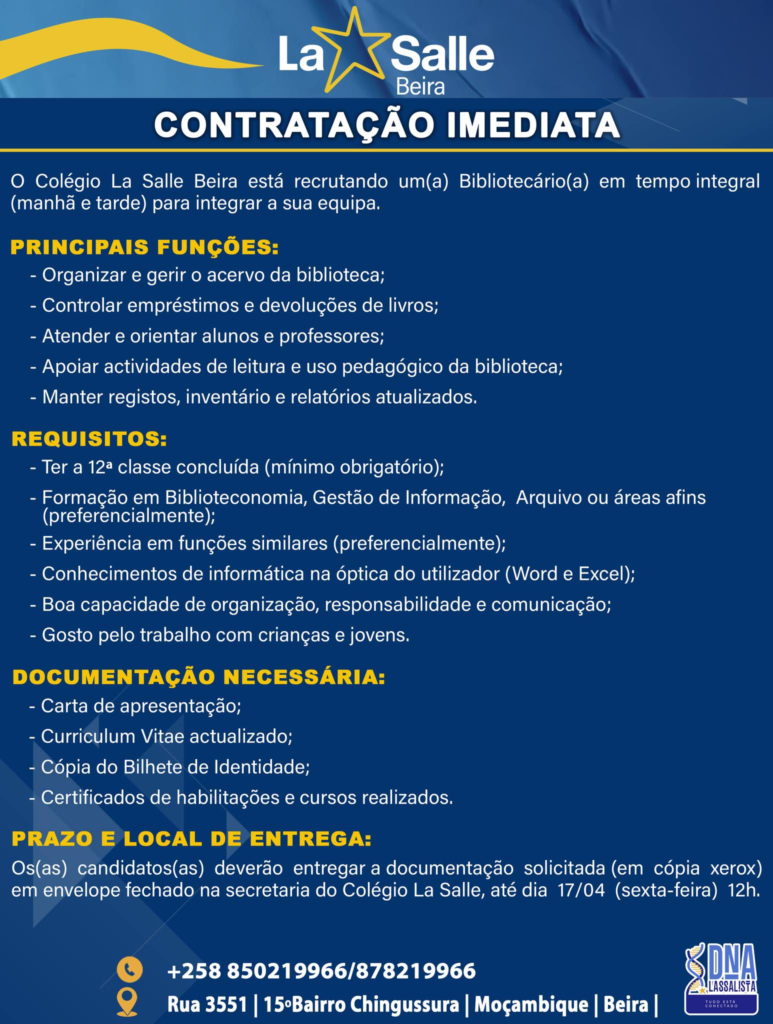 O Colégio La Salle Beira está recrutando um(a) Bibliotecário(a) em tempo integral (manhã e tarde) para integrar a sua equipa.