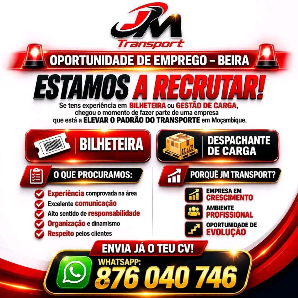 Envia já o teu CV para a sede em Maputo ou para o WhatsApp 87 604 0746 e faz parte da diferença.