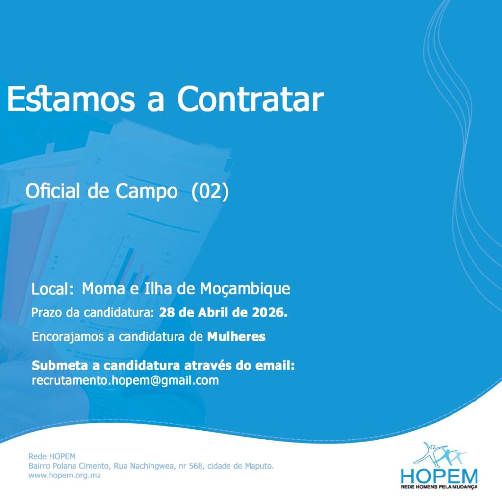 - A submissão das candidaturas deve ser acompanhada pela carta de motivação, CV, cópia de certificado de habilitações deve ser feito pelo endereço eletrónico: recrutamento.hopem@gmail.com, até ao dia 28 de Abril de 2026. No campo da submissão deve colocar o nome do distrito em que pretende candidatar-se.
