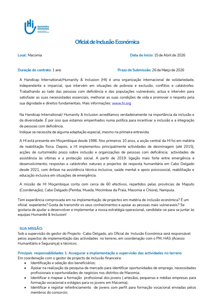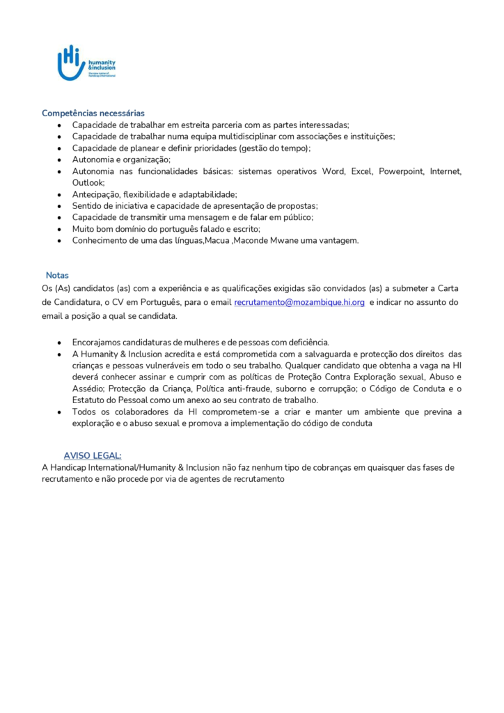 - A Humanity & Inclusion acredita e está comprometida com a salvaguarda e protecção dos direitos das crianças e pessoas vulneráveis em todo o seu trabalho. Qualquer candidato que obtenha a vaga na HI deverá conhecer assinar e cumprir com as políticas de Proteção Contra Exploração sexual, Abuso e Assédio; Protecção da Criança, Política anti-fraude, suborno e corrupção; o Código de Conduta e o Estatuto do Pessoal como um anexo ao seu contrato de trabalho.