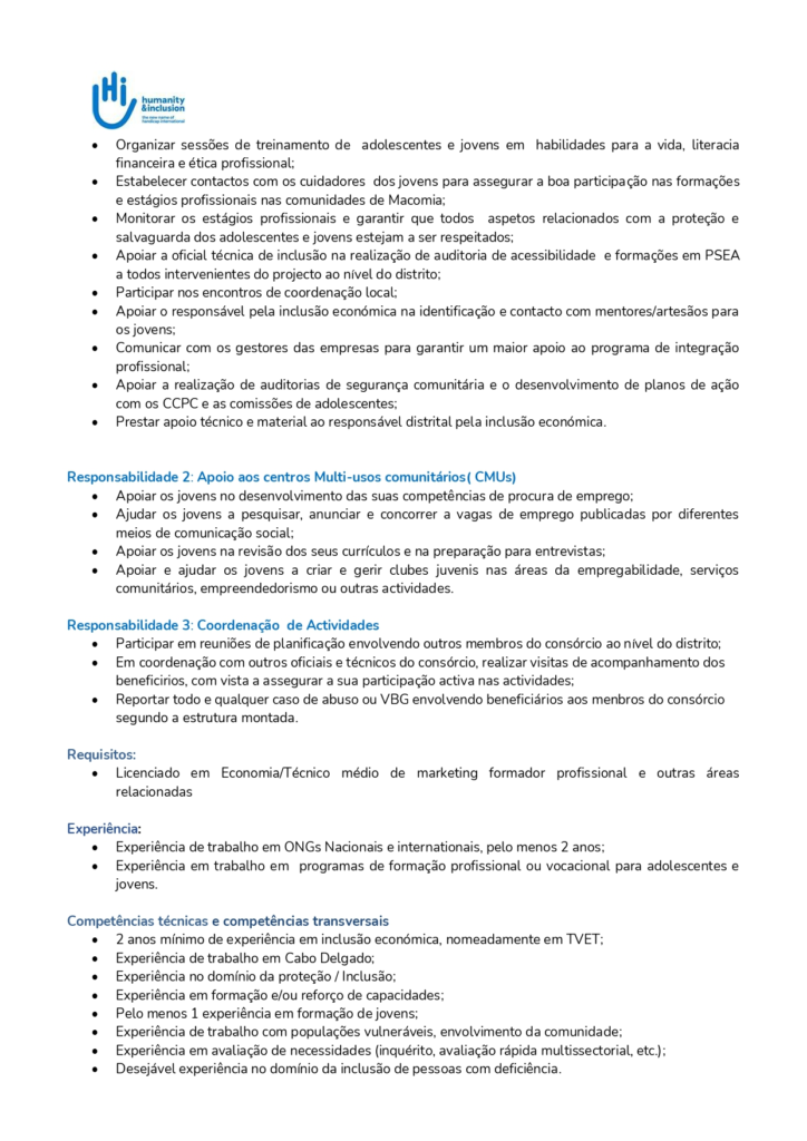 - Apoiar na realização da pesquisa de mercado para identificar oportunidades de emprego, necessidades profissionais e oportunidades de negócios nos distritos de Macomia;