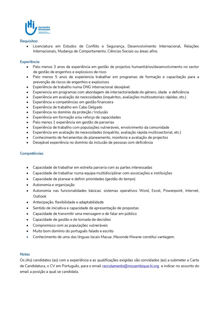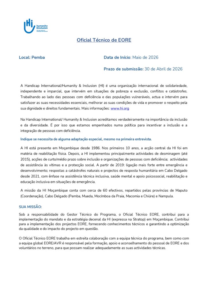 Os(as) candidatos(as) com a experiência e as qualificações exigidas são convidados(as) a submeter a Carta de Candidatura e o CV em Português para o email recrutamento@mozambique.hi.org e indicar no assunto do email a posição a qual se candidata.