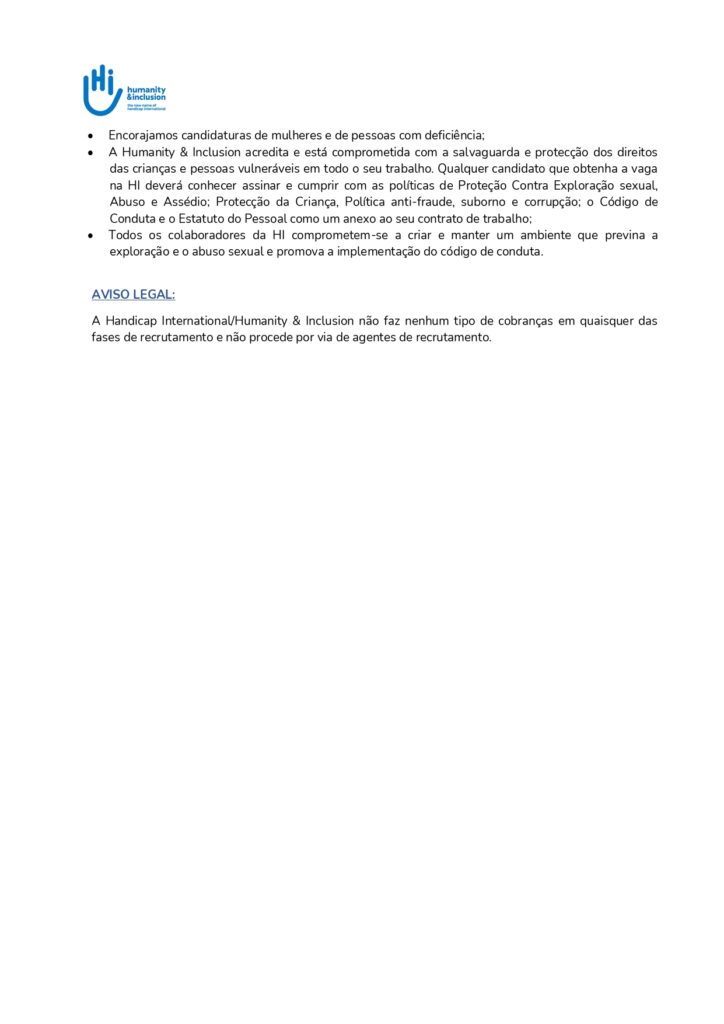 - A Humanity & Inclusion acredita e está comprometida com a salvaguarda e protecção dos direitos das crianças e pessoas vulneráveis em todo o seu trabalho. Qualquer candidato que obtenha a vaga na HI deverá conhecer, assinar e cumprir com as políticas de Proteção Contra Exploração sexual, Abuso e Assédio; Protecção da Criança; Política anti-fraude, suborno e corrupção; o Código de Conduta e o Estatuto do Pessoal como anexo ao seu contrato de trabalho.