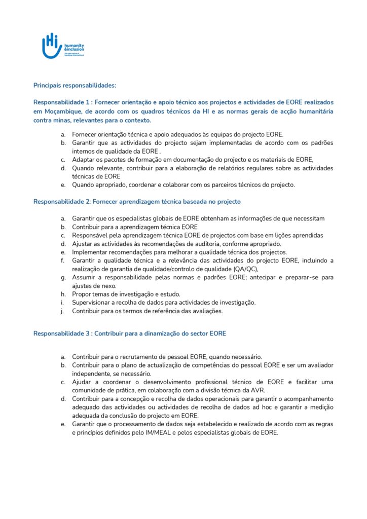 Responsabilidade 1: Fornecer orientação e apoio técnico aos projectos e actividades de EORE realizados em Moçambique, de acordo com os quadros técnicos da HI e as normas gerais de acção humanitária contra minas, relevantes para o contexto.